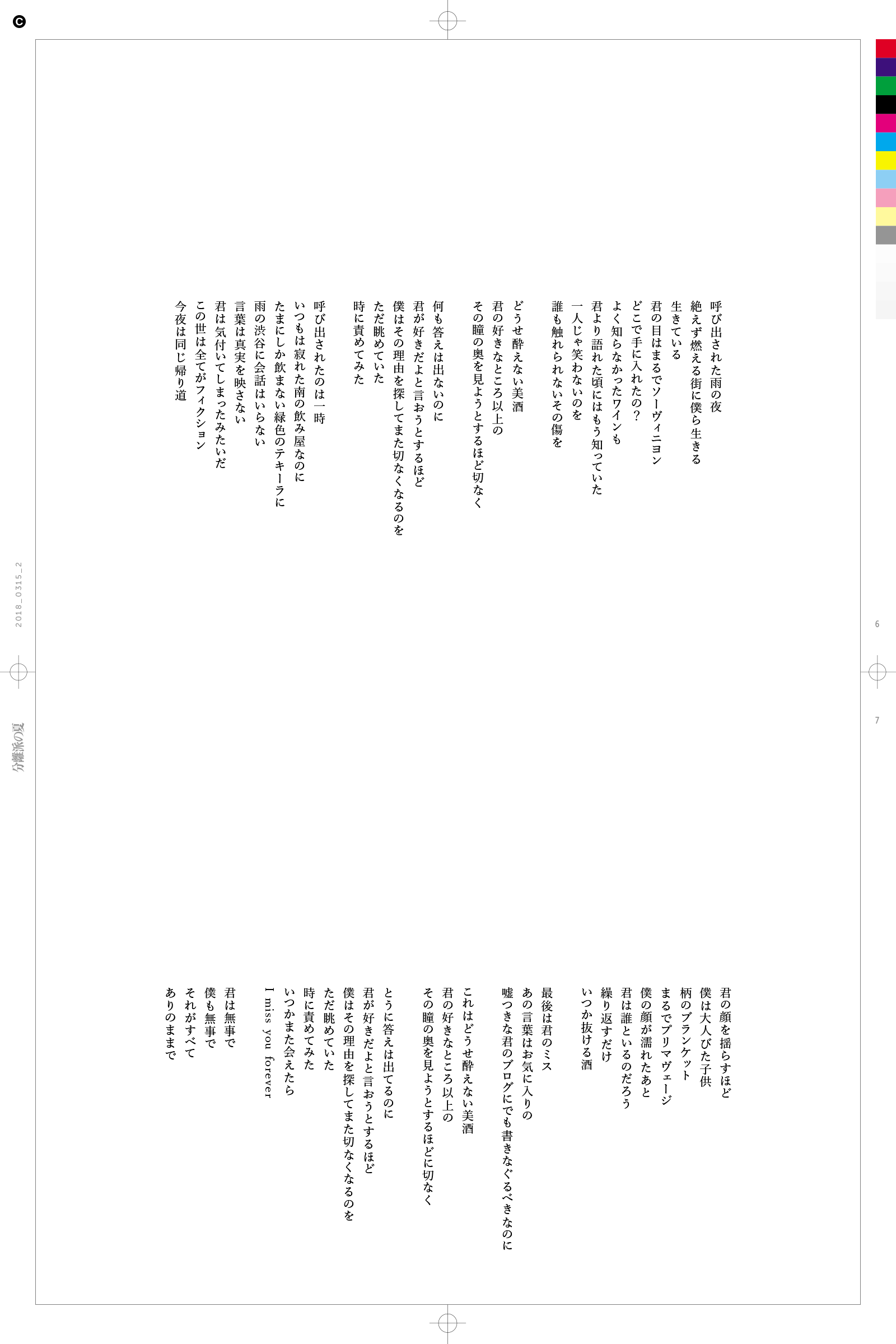 アートワークはタイトルロゴと肖像のみ。最後まで悩み抜き決めた表題は, 静かで力強い佇まいを持たせるべく日本文学に残る私小説を収集しながら制作を行いました。曲だけではなく詩にも耳を傾けてほしいという思いを込めて, ブックレットは曲ごとにページを分割せずに全14曲を連続して配置する体裁を取っています。
